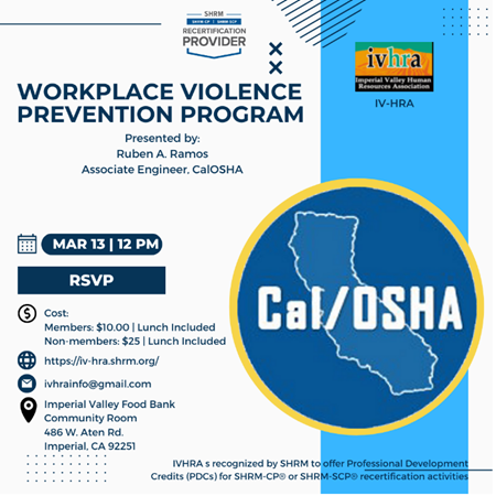 Join us to hear from CalOSHA regarding the required Workplace Violence Prevention Program. Bring your questions and walk away with information that will help you comply with the new requiement.