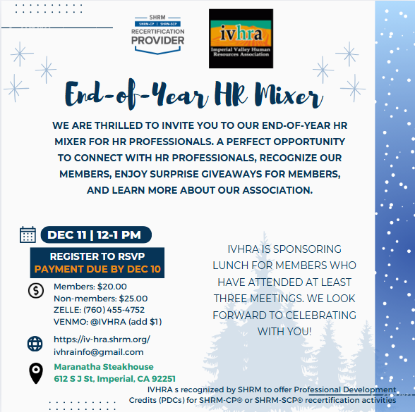 2024 IVHRA Members will be individually recognized! Join us to celebrate each other and wrap up another successful year.